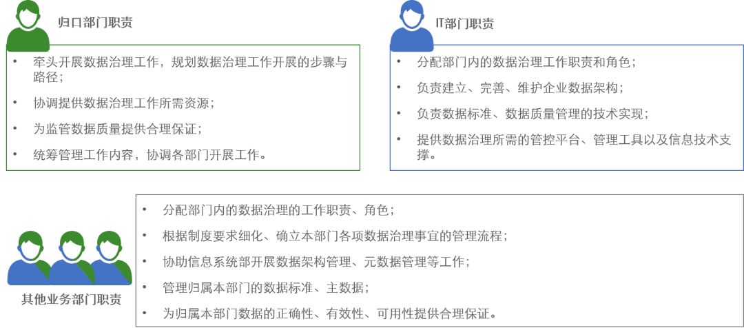 数据治理领域的协同工作,涉及银行前、中、后台众多部门,在数据治理归口部门的统筹下,各参与方依托各自部门的专业能力与数据管辖权,协同配合归口部门,开展数据治理工作。