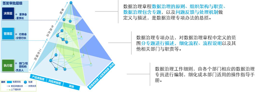 数据治理的顶层设计,明确了数据治理的归口管理部门。而推动数据治理工作在全行的落地生根,离不开银行各参与方的协同与配合。明晰各参与方的职责,理顺银行各部门间、各级机构间工作的协同关系,梳理数据治理领域各主要板块的管理流程,是构建制度体系的基础。