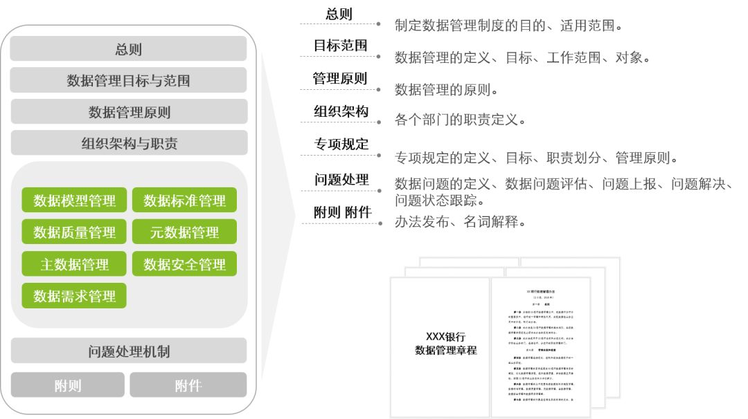 数据治理工作涵盖内容广泛,涉及专业领域众多。银行需在《数据治理章程》的指引下,依托数据治理原则与组织架构职责,根据数据治理各专项领域的工作特点,制定各专项领域的管理办法,用来指导各项工作在全行的有序开展。