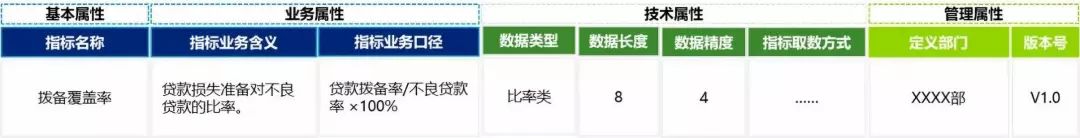 以“拨备覆盖率”指标为例,从数据标准化的角度来看,首先需要定义其业务含义,以明确其定位和用途,统一业务解释;同时通过技术属性明确其指标技术口径和取数规则等,确保指标数据计算结果的一致性。这样,在整个银行层面,统一了“拨备覆盖率”的业务口径和技术口径,最终确立了其使用规范。