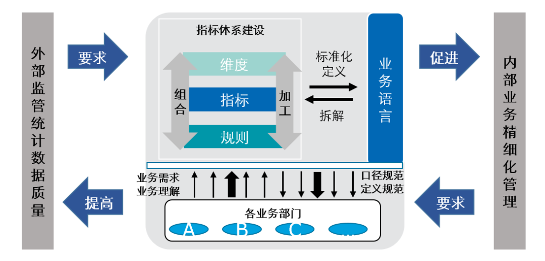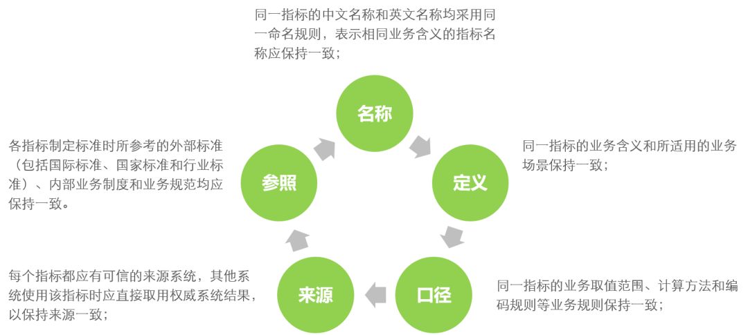 由此可见,指标数据标准确立的是指标数据全行层级统一使用的规范,为内部数据分析应用与外部监管指标报送提供指导性、规范性要求。