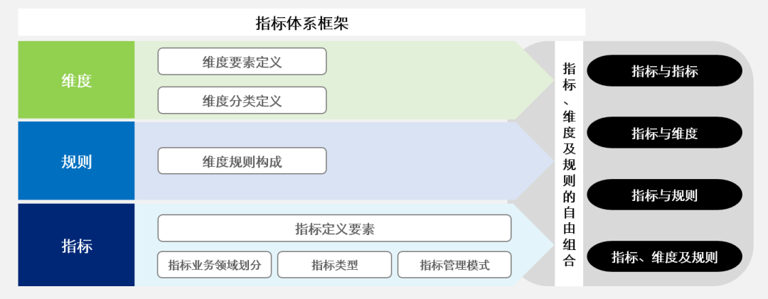 基础指标可以与维度及统计规则自由组合形成多视角的指标内容,拓宽了指标定义的广度,并且提高了指标使用的灵活度。