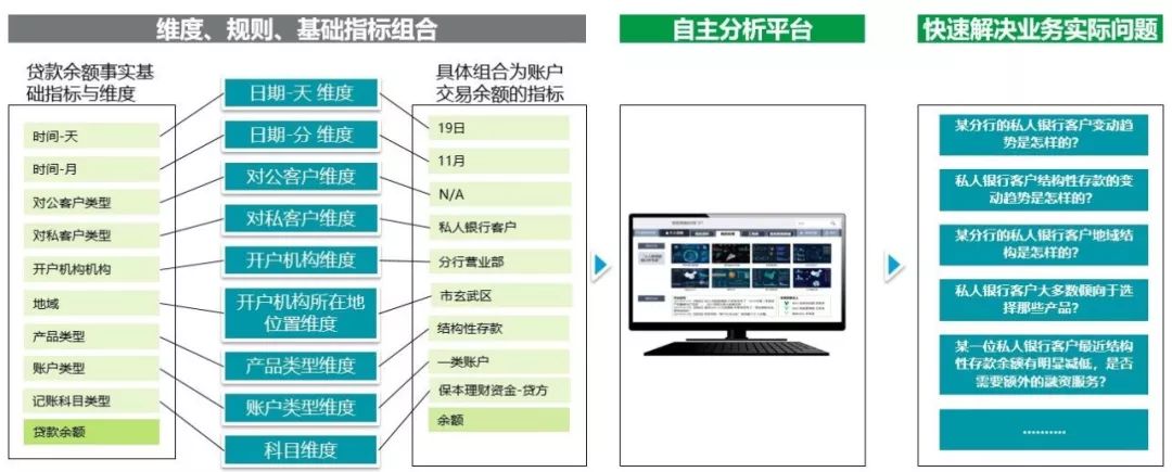 维度是对银行在业务经营过程中所涉及对象的属性进行划分的方式。维度作为观察事物的视角,并不孤立存在,而是通过与指标结合使用,可以对指标的不同方面进行对比与分析。如,对公贷款余额,可按机构维度来统计各分支机构的对公贷款余额,也可以按行业维度来分析银行贷款业务主要的行业分布情况,控制行业集中度或调整投向分布。维度的定义要素包括,维度编号、维度名称、维度分类、维度定义格式、维值名称等。