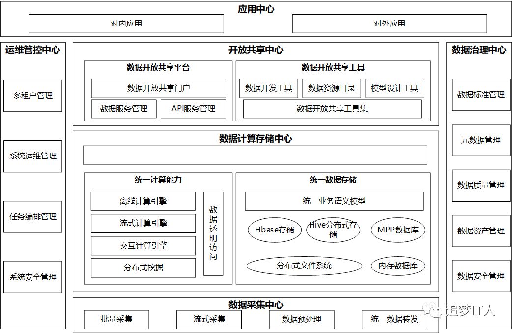 大数据平台则是指以处理海量数据存储、计算及流数据实时计算等场景为主的一套基础设施,包括了统一的数据采集中心、数据计算和存储中心、数据治理中心、运维管控中心、开放共享中心和应用中心。大数据平台之所以能够建设起来,不外乎内因和外因,外因是棱镜门事件带来的去IOE要求、外部硬件的变革和分布式开源技术的涌现,另外一篇《去IOE or not》已有阐述,不再赘述;内因是非结构化、实时数据和海量数据的计算和存储压力,企业也寄希望从大数据平台除了满足对内需求,也能够实现一定的对外收益。大数据平台的建设出发点是节约投资降低成本,但实际上无论从硬件投资还是从软件开发上都远远超过数据仓库的建设,大量的硬件和各种开源技术的组合,增加了研发的难度、调测部署的周期、运维的复杂度,人力上的投入已是最初的几倍;还有很多技术上的困难也非一朝一夕能够突破,但无论如何大数据平台还是建设起来了,人员能力也在不断成长。大数据平台解决了海量数据、实时数据的计算和存储,也基于原来的企业数据模型实现了重构,但也面临着一系列的问题,首先是数据的应用问题,无论是数据仓库还是大数据平台,里面包含了接口层数据、存储层数据、轻度汇总层、重度汇总层、模型层数据、报表层数据等等,各种各样的表有成千上万,这些表有的是中间处理过程,有些是一次性的报表,不同表之间的数据一致性和口径也会不同,而且不同的表不同的字段对数据安全要求级别也不同,此外还要考虑多租户的资源安全管理,如何让内部开发者快速获取所需的数据资产目录,如何阅读相关数据的来龙去脉,如何快速的实现开发,这些在大数据平台建设初期没有考虑周全;另外一个问题是对外应用,随着大数据平台的应用建设,每一个对外应用都采用单一的数据库加单一应用建设模式,独立考虑网络安全、数据安全、共享安全,逐渐又走向了烟囱似的开发道路。