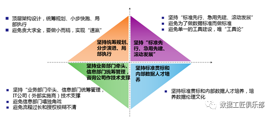 3.“四个坚持和五个避免”:①坚持统筹规划、分步演进、局部执行,避免贪大求全;②坚持“标准先行、急用先建、滚动发展”,避免单一工具建设,避免为了做数据标准而做标准;③坚持“业务部门牵头、信息部门统筹管理,服务公司作技术支撑”,避免唯信息部门孤军作战、避免流程过长和授权模糊不清;④坚持标准贯标和内部数据人才培养,培养数据伦理文化。