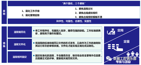 一个良好的数据治理项目需要一个计划周详的数据治理框架、明确的管理办法和规定以及清洗的分级审核流程。梳理数据管理流程,采用“两个简化,三个避免”的原则,着眼于整体设计,业务流程和数据流程充分衔接(恰当的时机,合理的时耗)。并采用定岗、定量、考核与激励并举的措施,保证数据流程效率和强有力的管控能力。