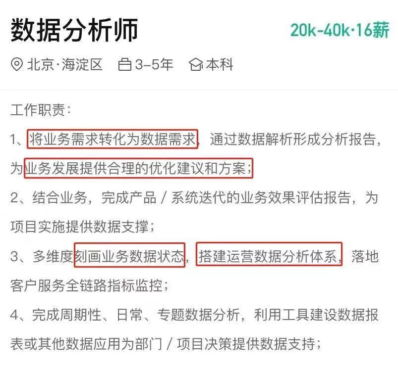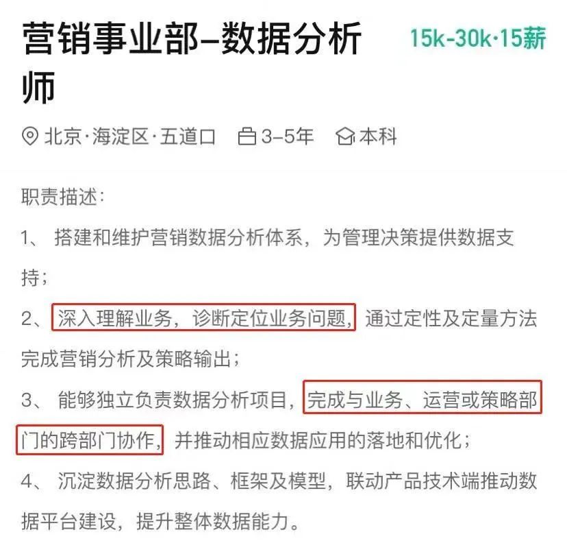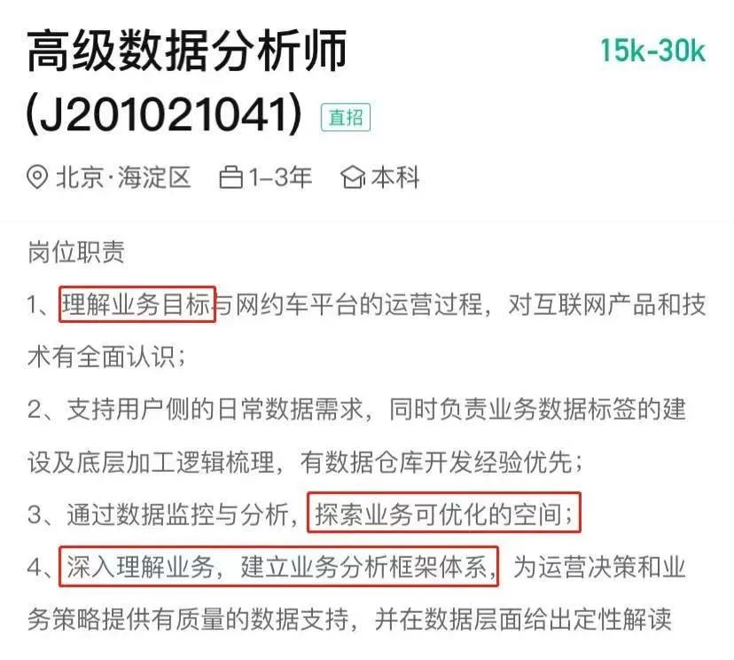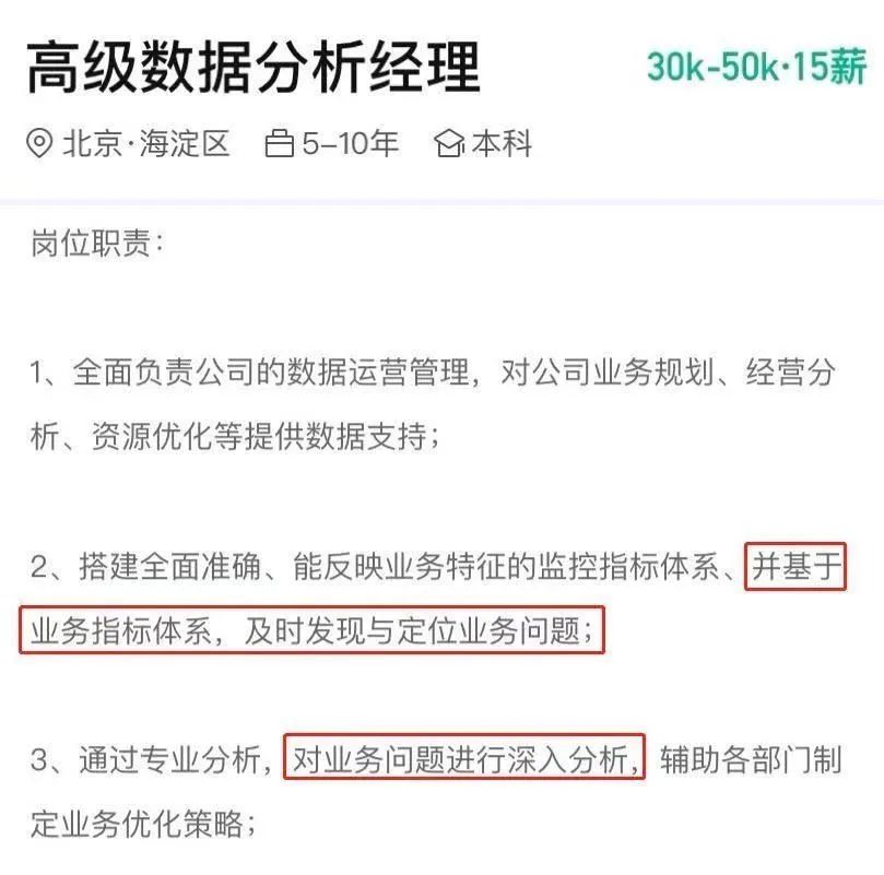 但这些高薪岗位招聘中无一例外都强调两个字——业务,这就告诉我们数据分析师一个道理:所谓的数据分析能力,不应该只是获取数据、清洗数据、数据建模、数据统计等操作方法。熟练运用工具只是基本功,难的是知道要用这些工具来分析什么;或者分析后怎么解决业务问题,怎么快速获得商业价值。所以对每个数据分析师来说,懂业务已成为了当代数据分析岗最需要掌握、最有潜力的能力之一。做数据分析几年了,我见过太多不懂业务的数据分析师,举个栗子🌰: