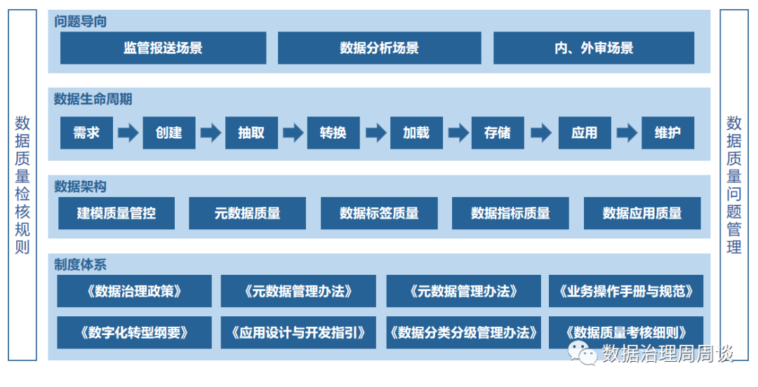 质量问题错综复杂,想要处理好质量问题,最好能够从几个突破口着手,就商业银行而言,数据质量问题出现的场景有几种:在监管检查时,通过数据质量检查规则,往往会发现数据不准确、不完整等问题。例如,在核验过程中发现客户评级信息为空的问题,说明客户信息系统及内部评级系统缺少对客户财务数据完整性的核验。若企业有完善的数据质量管控体系,即可提前预警或减少此类问题的出现。在经营管理过程中,往往需要通过数据分析提供支持和参考。举例来说,业务部门需要通过报表或指标查看经营情况,在指标开发过程中可能会出现标准不统一、指标口径不一致的问题;在面向客户营销时,可能因数据质量低下导致营销不准确,转化率无法达到期望的问题;在风险控制方面,风险是多方面的,包括信贷风险、市场风险、运营风险等,高质量数据是降低风险、减少企业损失的保障。从数据治理的角度来讲,内、外审部门定期对企业进行审计,除数据质量检查规则外,企业需要意识到政策和流程的必要性,即企业需具备由完善的数据质量管控体系提供的数据质量检查政策、程序及考核评价体系。02