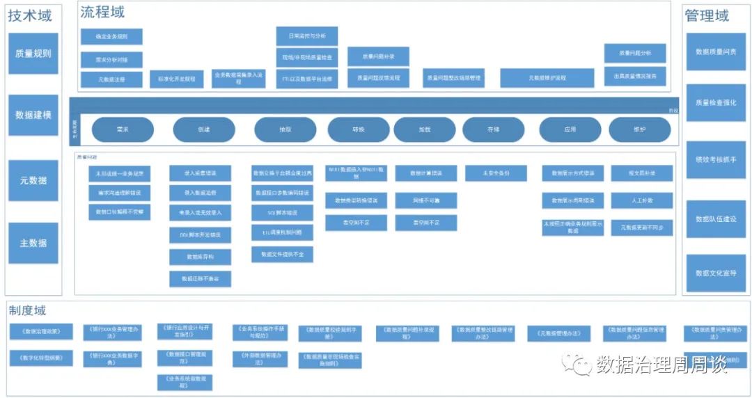 除上述举例外,实际很多场景都可能出现数据质量问题,遍历梳理整个银行系统的数据流转过程,就会发现数据的生命周期分为需求、创建、抽取、转换、加载、存储、应用和维护八个阶段,在各个阶段数据质量问题的成因也各不相同,将其归纳成以下几类:一是业务部门未形成统一规范的业务规则手册,导致无法有效运用于数字化落标。二是系统建设未充分覆盖监管机构统计口径与银行总分账统计口径间的差异,导致报表数据与实际情况没有形成逻辑一致性。三是业务部门与开发部门需求对接发生了理解偏差,业务规则未正确转化成取数规则。由于业务源系统的数据库种类不同,主流的关系型数据库有Oracle,SQL SERVER,DB2,SYBASE等,或新老数据库迁移,数据从以上各类不同的生产系统数据库表和文件中抽取到数据仓库,天然就存在数据异构问题。业务部门没有严格遵守数据采集录入规范,其中包括:未完整录入、录入无效数据、采集录入数据造假。一是数据仓库或应用层与源系统之间采用直接数据库连接方式抽取和交换数据,系统架构耦合性过高导致空间不足、锁表等异常。二是传输交换系统和网络不可靠产生的数据丢包异常。三是抽取过程中出现接口参数编码问题、配置信息错误以及锁库锁表形成的数据质量问题。四是转换环节可能发生SQL脚本错误、表空间不足、字段类型转换出错、NULL数据插入非NULL字段形成的数据质量问题。五是调度机制和算法存在问题,导致取数时点错误,源数据在整合成报表数据时发生计算错误。经过ETL服务器进行清洗加工处理后,大部分数据应是规范和符合标准的,但是在应用层也可能由于业务规则的定义错误和查询方式异常导致数据最后展示的结果不正确。开发部门元数据管理不规范,导致表间关系、库间关系在发生质量问题后无法有效溯源。后期在监管报送等紧急情况下,随意进行人工调整,如在报文层随意补录、调整报表数据,导致越补越乱、越改越错。如缺乏对业务人员和运维人员的必要技能培训和合规宣导,或管理部门没有起到应尽的督导责任、未做好数据备份和存储、开发项目管理不规范、缺乏必要的维护文档和技术支持,也会导致对数据质量产生间接影响。03