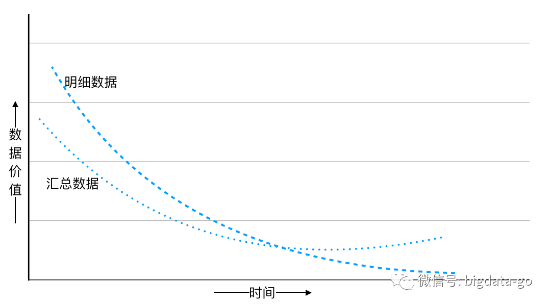 在数据的生命周期中,数据价值决定着数据全生命周期的长度,并且数据价值会随着时间的变化而递减。从明细和汇总数据的数据价值分析随时间变化来看,而且明细数据的有用性递减曲线要比汇总数据的更加陡峭。此外,随着时间推移汇总数据有用性曲线趋于平缓,有时还会上升;而明细数据会趋向渐进地接近于零。