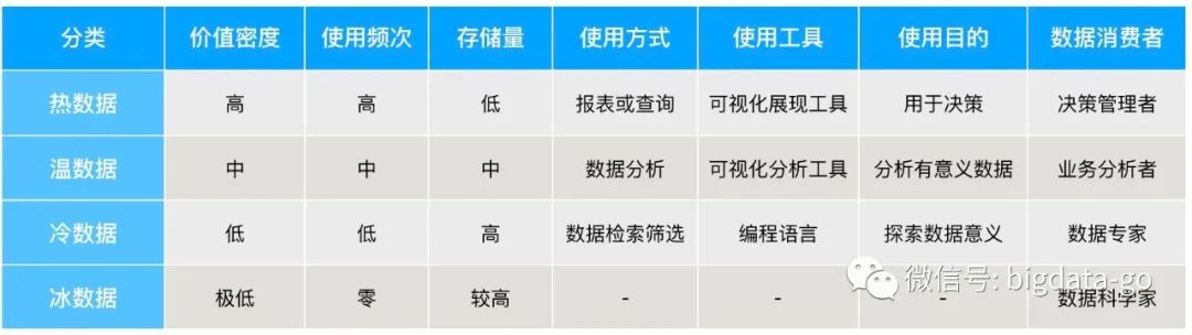 热数据服务于决策管理者,建议采用存储量低,但对时效性、稳定性和可用性要求较高存储技术;温数据服务于数据分析者,建议采用存储稍高,计算资源性能高能支持数据分析工具有效发挥的存储和计算引擎;冷数据服务于数据科学家,建议采用大容量、批量计算能力和可扩展存储技术;冰数据采用超大容量,超低成本用于归档的存储技术。
