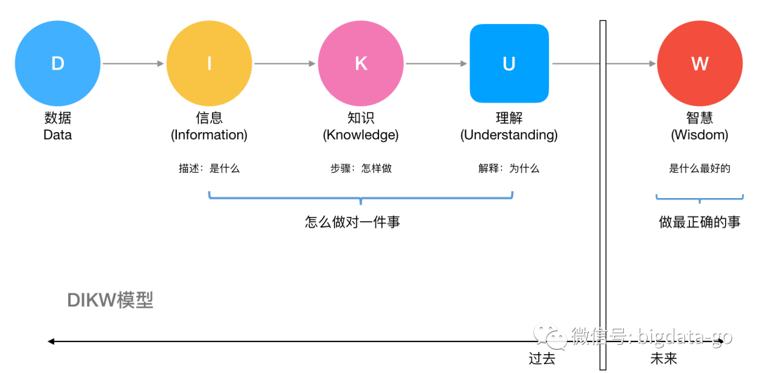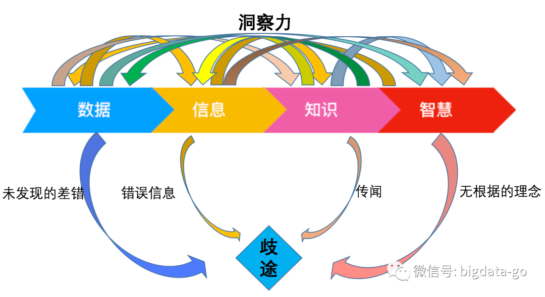 但信息并非知识,知识并非智慧,智慧也并非远见卓识。数据是基本的模块,可通过各种组织方法构成信息:信息则可以转化为实用的知识,知识在理想的情况下转换为智慧。如果这一发展过程看作一个整体,那么每个阶段都可能会产生各种洞察力。但由于各阶段中可能出现差错或错误信息等,为了避免误入岐途,一定事先做好风险评估。