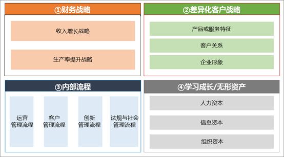 指标体系要素框架是从集团整体建立的指标体系,该指标体系全面反映集团的整体情况,而不是局限于局部或某些具体方面。指标体系框架是基于战略构建“四面墙”平衡记分卡模型(即:财务战略、客户战略、流程、学习成长),以集团战略为核心,以各部门的工作职能为出发点,对核心业务逐层分解,分类梳理,归纳核心和关键业务环节,进行的指标数据分类选取的体系化设计。指标体系框架设计“四面墙”原理如下: