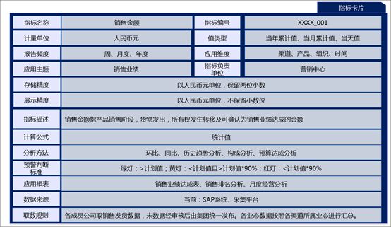 3)详细定义指标数据,如指标数据项来源、指标数据项数据格式、指标数据项计算公式、指标数据项取数口径等信息;