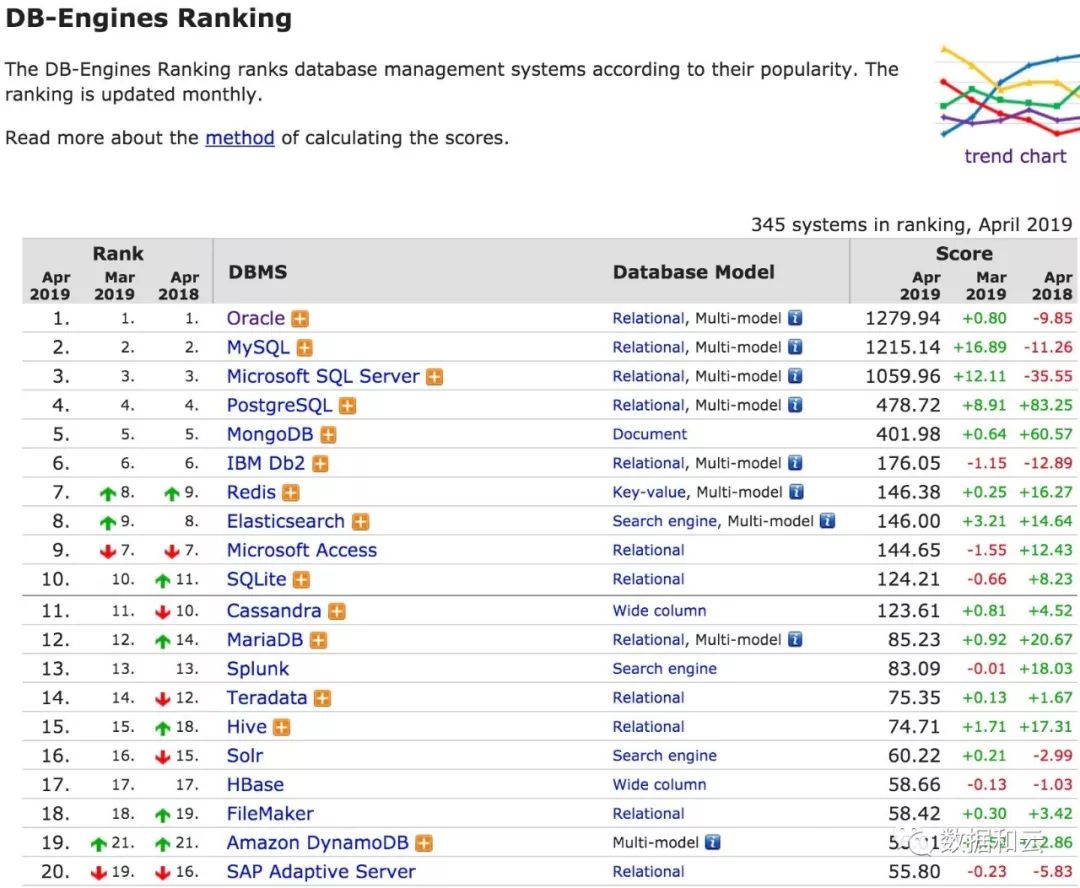 下图是DB-Engines排行榜上前20位的数据库产品: