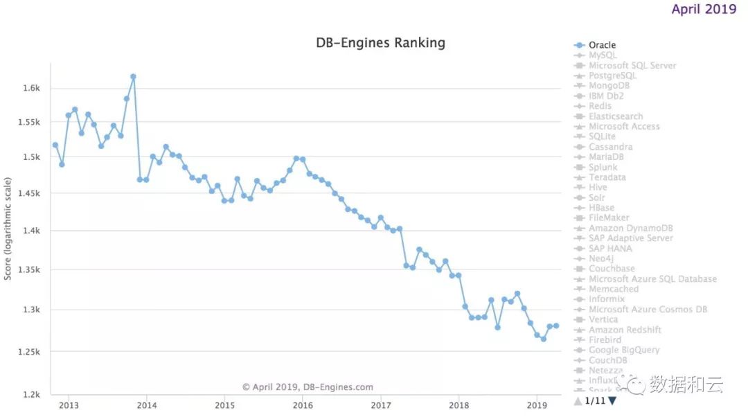 云的浪潮席卷之下,数据库的商业模式正在改变,从趋势上看,自2014年开始Oracle数据库的积分就在曲折下行,这也是Oracle在坚定的进行云转型的根源所在。