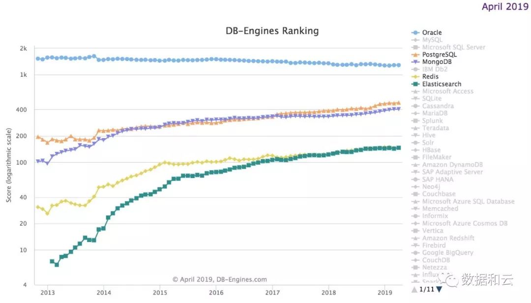 在Oracle之外,不断分裂数据库市场的开源四小龙正在云时代奋起称雄,PostgreSQL和MongoDB交错上升,保持了持续的增长势头;Redis和Elasticsearch在细分市场应用广泛。