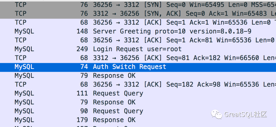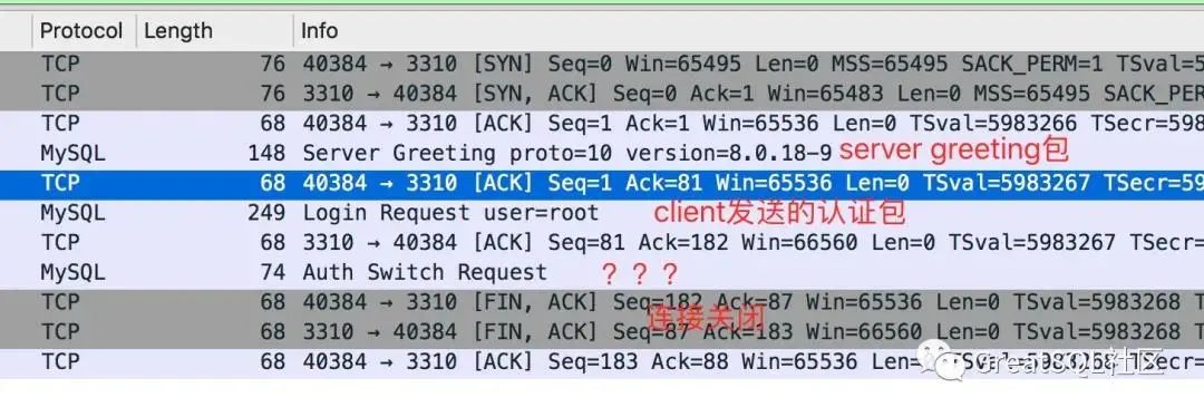 前两个包很正常,第三个包第一次见,wireshark解析的叫做 AuthSwitchRequest。