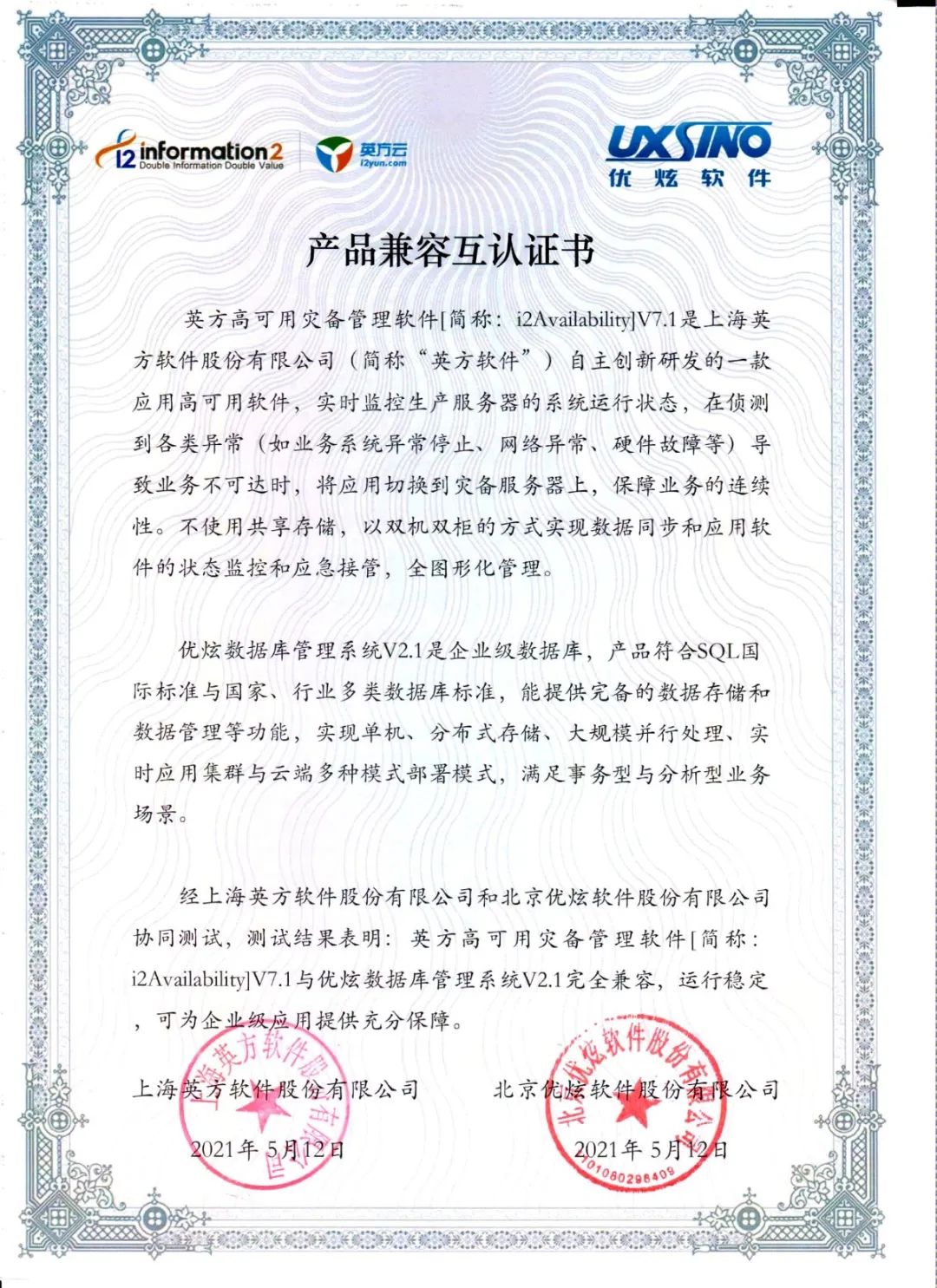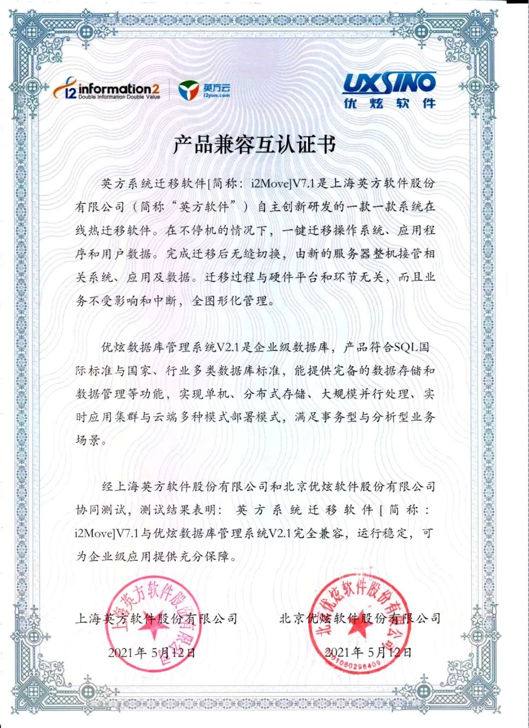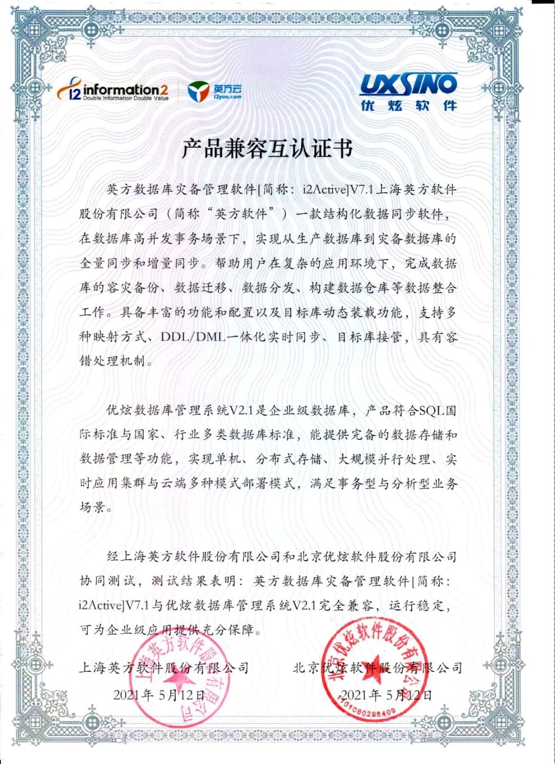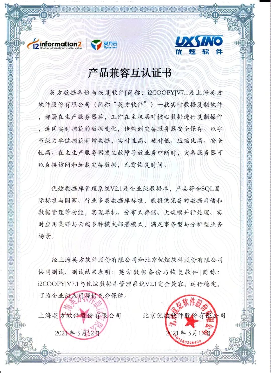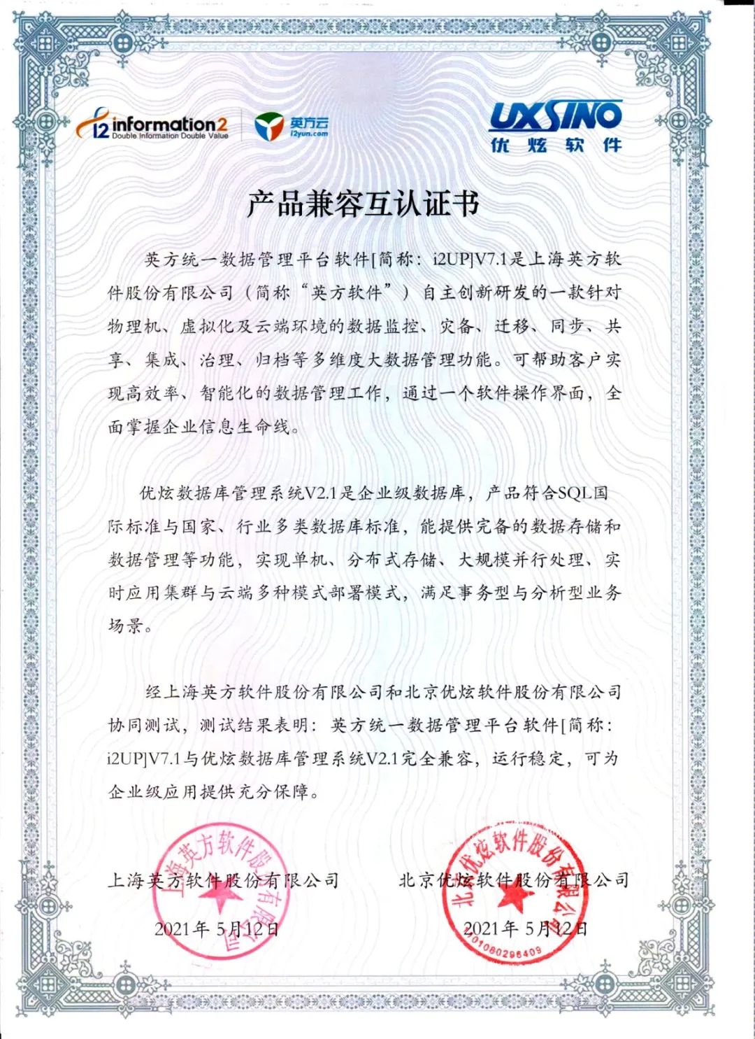 近日,北京优炫软件股份有限公司与上海英方软件股份有限公司完成了产品兼容性认证工作。