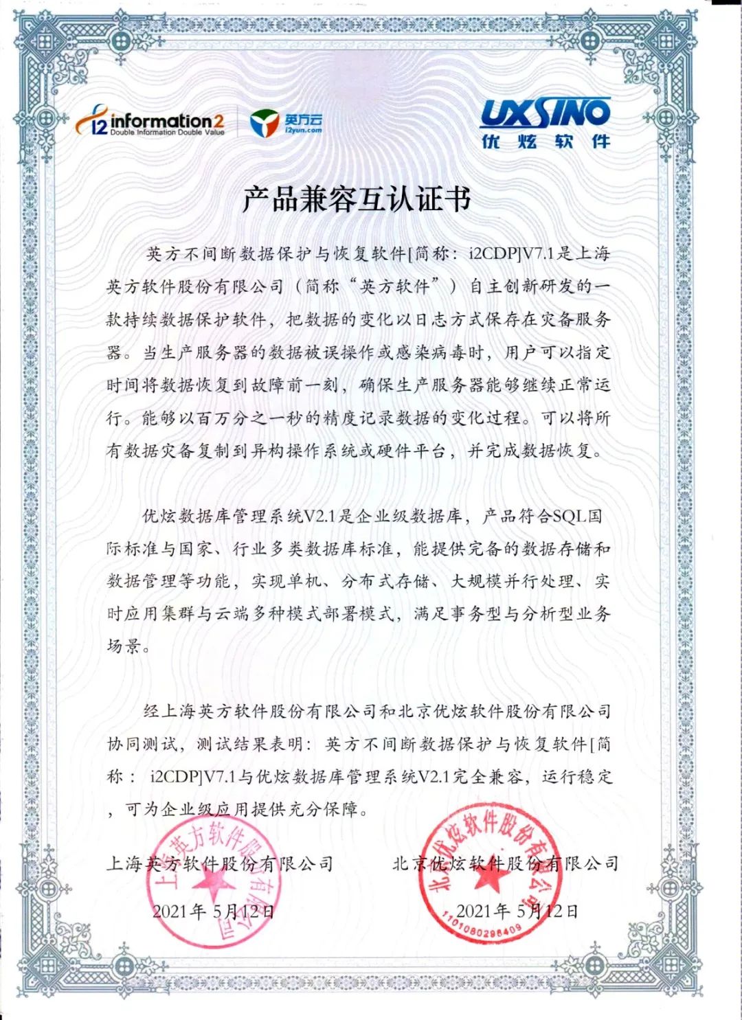 此次互认证的产品是优炫数据库管理系统V2.1和英方高可用灾备管理软件i2Availability、英方数据库灾备管理软件i2Active、英方不间断数据保护与恢复软件i2CDP、英方数据备份与恢复软件i2COOPY、英方统一数据管理平台软件i2UP、英方系统迁移软件i2Move六款软件产品完成了兼容性互认证。测试结果显示,双方产品完全兼容,运行稳定,性能优异,能够满足用户的关键性应用需求。