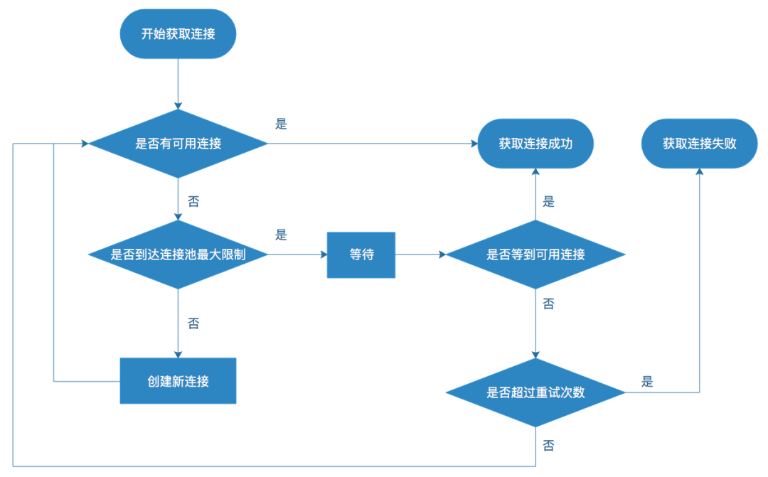 我们先看一下非多路复用协议如何设置连接池大小。连接池涉及到的参数一般有:最小连接数、最大连接数、最大空闲时间、连接获取超时时间、连接获取超时重试次数等。应用与连接池主要交互逻辑如下所示: