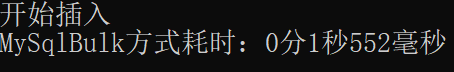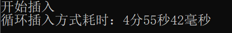 //开始时间var startTime = DateTime.Now;using (var conn = new MySqlConnection(connsql)){conn.Open();//插入10万数据for (var i = 0; i < 100000; i++){//插入var sql = string.Format("insert into trade(id,trade_no) values('{0}','{1}');",Guid.NewGuid().ToString(), "trade_" + (i + 1));var sqlComm = new MySqlCommand();sqlComm.Connection = conn;sqlComm.CommandText = sql;sqlComm.ExecuteNonQuery();sqlComm.Dispose();}conn.Close();}//完成时间var endTime = DateTime.Now;//耗时var spanTime = endTime - startTime;Console.WriteLine("循环插入方式耗时:" + spanTime.Minutes + "分" + spanTime.Seconds + "秒" + spanTime.Milliseconds + "毫秒");