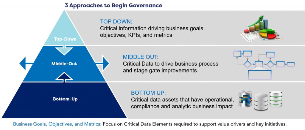 这就引出了下一个关键问题:您的数据治理方法是什么?您希望像公共图书馆一样对每个数据元素进行编目吗?这被称为“自下而上”的方法。也许您需要控制业务流程和相关数据来驱动业务结果?这就是所谓的“中间偏出”策略。也可能是您的组织希望治理来监视和管理围绕业务的目标、目标和度量的数据。这就是“自上而下”的方法。