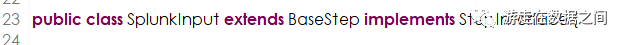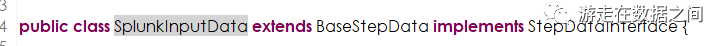 public class SplunkInputData extends BaseStepData implements StepDataInterface {public RowMetaInterface outputRowMeta;public SplunkConnection splunkConnection;//splunk连接public int[] fieldIndexes;//字段索引数组public String query;//splunk spl语句(必须以search开头)public IMetaStore metaStore;//元数据仓库对象public ServiceArgs serviceArgs;//splunk查询服务参数public Service service;//splunk查询服务public InputStream eventsStream;//输入事件流}