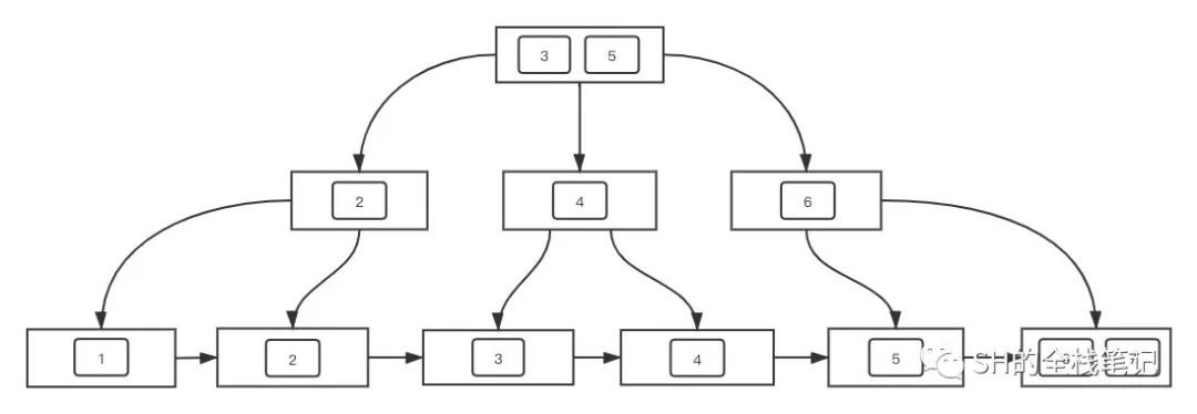 并且,在B+树中,除了叶子节点存储了真实的数据之外,其余的节点都只存储了指向下一节点的指针。换句话说,数据全部都在叶子节点上。而在B树中,所有的节点都可以存储数据,这是一个最主要的区别。