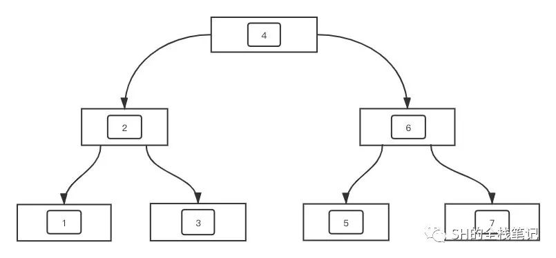 下图是包含了整数「1-7」的B树,这个图应该会帮助你加深对两者区别的理解。