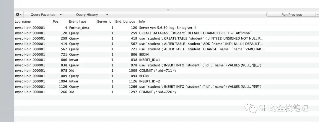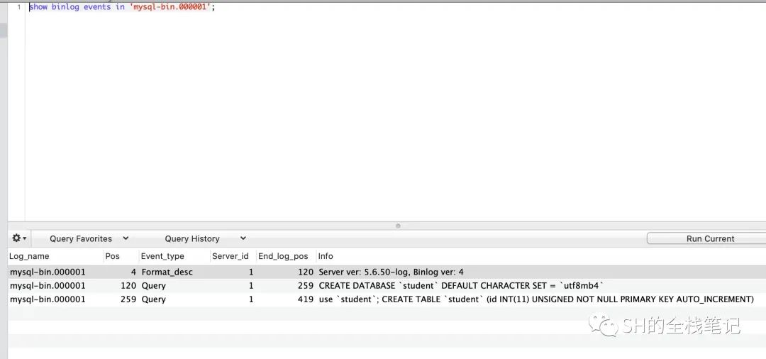 那一列。可以看到内容为Server ver;5.6.50-log, Binlog ver: 4