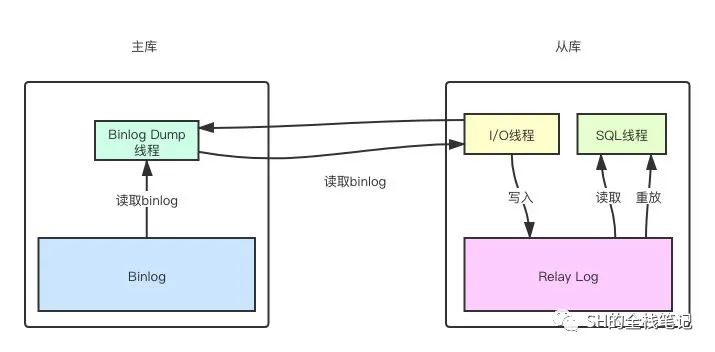 主库启动binlog dump线程,读取主库上的binlog event发送给从库的I/O线程,I/O线程获取到binlog event之后将其写入到自己的Relay Log中。