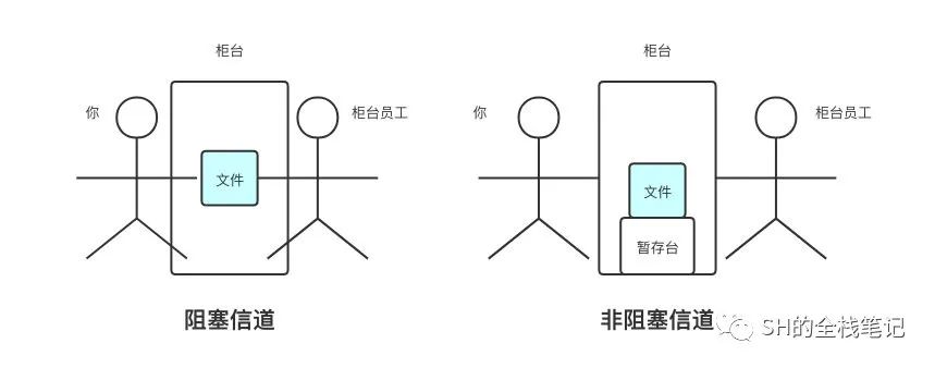 阻塞信道就跟你在柜台一样,你要递归柜员一个东西,但是你和柜员之间没有可以放东西的地方,你就只能一直把文件拿着,直到柜员接手;而非阻塞信道就像你们之间有个地方可以放文件,你就直接放上去就好了,不用等柜员接手。