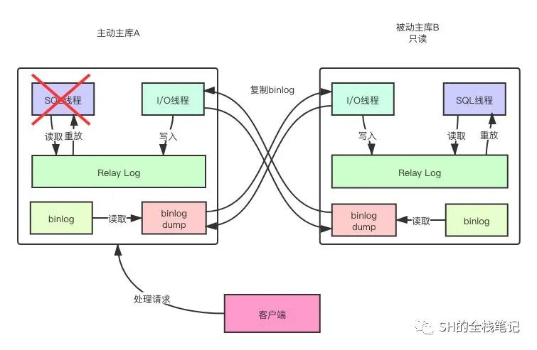 其用途在哪里呢?例如我们要在不中断服务的前提下对MySQL进行维护、优化,举个例子——修改表结构。假设我们有两个数据库,主库A和被动主库B,注意此处的被动主库是只读的,我们先停止A对B的复制,也就是停掉A上的SQL线程。