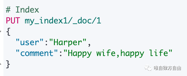 | Index | PUT my_index/_doc/1 {"user":"Harper","comment":"Happy wife,happy life"} |