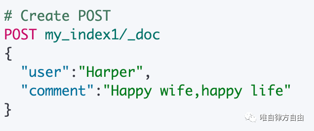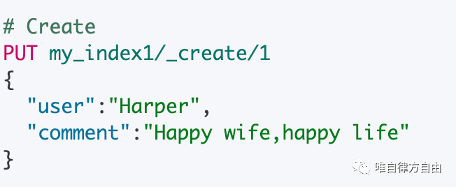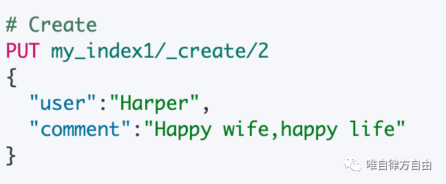 | Create | PUT my_index/_create/1 {"user":"Harper","comment":"Happy wife,happy life"} POST my_index/_create/_doc (不指定 ID,自动生成) {"user":"Harper","comment":"Happy wife,happy life"} |