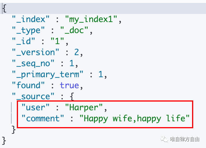| Update | POST my_index/_update/1 {"doc":{"user":"Harper","comment":"Happy wife,happy life.This is why we life."}} |