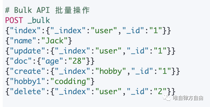 Bulk API(批量操作)的作用:在访问网络 Rest API 时,每一次的访问都需要重新建立网络开销,因此是非常消耗资源性能的。而 Bulk API 的核心思想就是在一次 Rest 请求中,对不同索引执行多次操作,减少不必要的建立网络的开销,Bulk API 支持四种操作类型:Index、Create、Update、Delete(注意没有 Read 操作)。