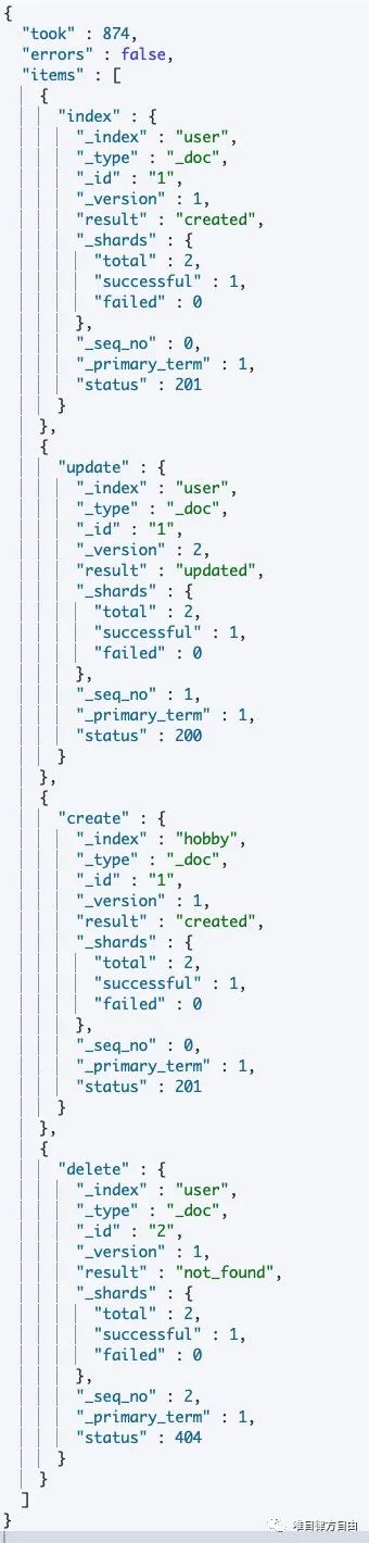 在 Bulk API 操作过程中,如果有单条操作失败,并不会影响其他操作,同时,返回结果包含了每一条操作的执行结果。