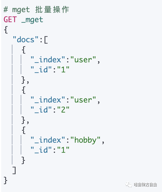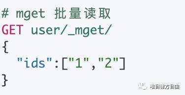 mget 和 Bulk API 的思路是一样的,都是为了减少网络连接所产生的开销,以提高性能。通过提供一些列的文档 ID,在一次 API 请求中,就可以将所有的文档信息返回。
