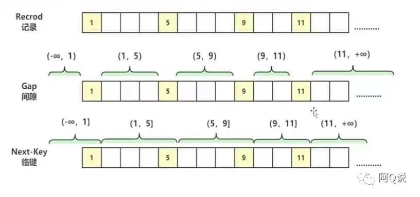 我们将数据库中存储的每一行数据称为记录。则上图中1、5、9、11分别代表id为当前数的记录。对于键值在条件范围内但不存在的记录,叫做间隙(GAP)。则上图中的(-∞,1)、(1,5)...(11,+∞)为数据库中存在的间隙。而(-∞,1]、(1,5]...(11,+∞)我们称之为临键,即左开右闭的集合。