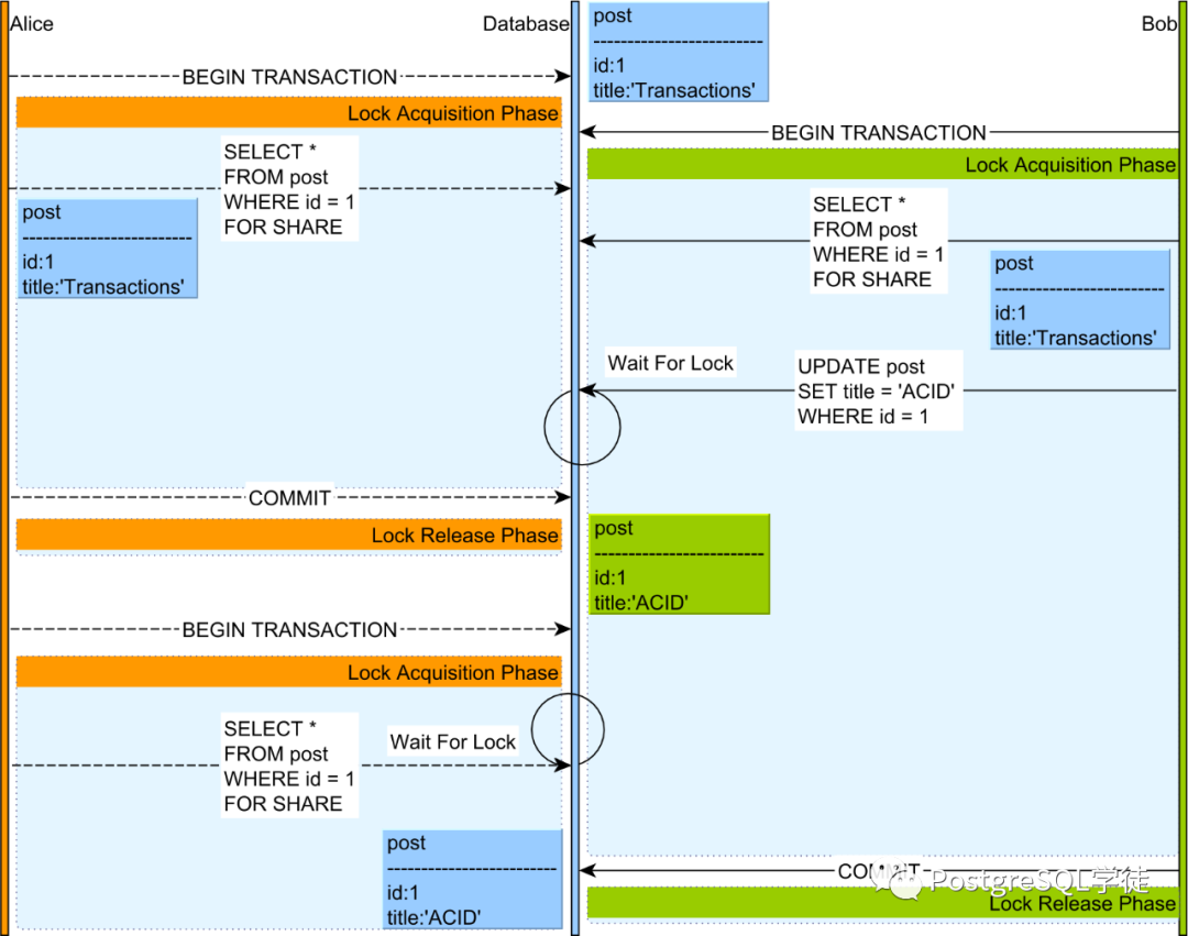 Alice 启动一个新事务并发出一个 SELECT FOR SHARE 查询,并为同一个 post 条目发出一个读锁获取请求,但该语句被锁管理器阻止,因为 Bob 拥有该记录的排他锁。
