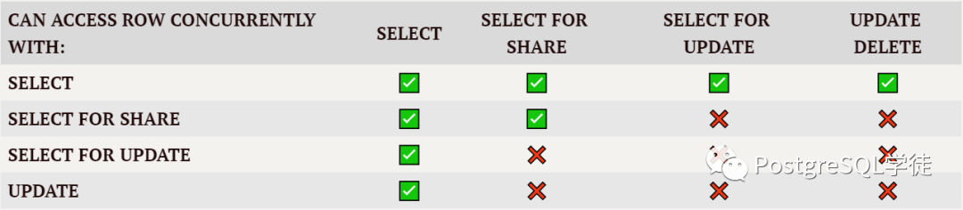 ACCESS SHARE和ACCESS EXCLUSIVE可以理解为多版本读/写,SELECT会在查询的表上获取ACCESS SHARE,而那些很硬的操作,诸如TRUNCATE、DROP TABLE等都会获取ACCESS EXCLUSIVE。