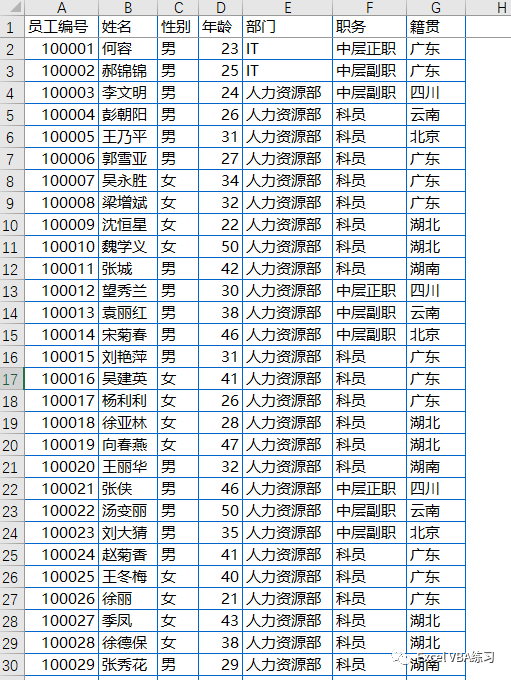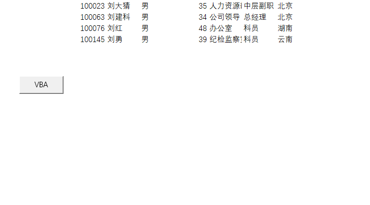 Sub Like_StrName()Dim aData, aResDim intx&, inty&, iRow&, strName$aData = Range("a1").CurrentRegionReDim aRes(1 To UBound(aData), 1 To UBound(aData, 2))iRow = 1For intx = 2 To UBound(aData)strName = aData(intx, 2) '姓名If strName Like "刘*" Then '判断是否刘姓iRow = iRow + 1For inty = 1 To UBound(aData, 2) '遍历写入内容aRes(iRow, inty) = aData(intx, inty)NextEnd IfNextFor inty = 1 To UBound(aData, 2) '写入表头aRes(1, inty) = aData(1, inty)NextWith Range("K10").Resize(iRow, UBound(aRes, 2)).Value = aRes '输出内容.Borders.ColorIndex = 23 '边框.Columns.AutoFit '自适应列宽End WithEnd Sub