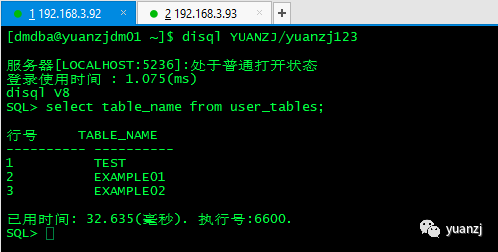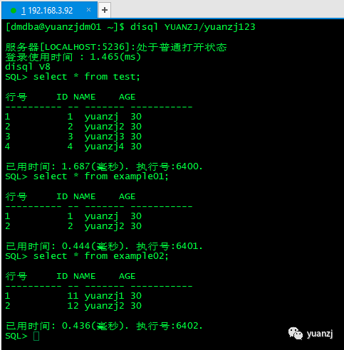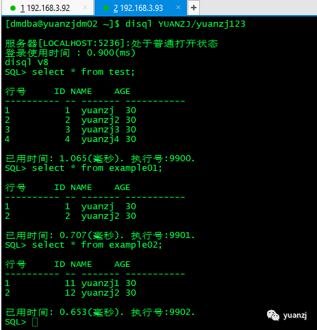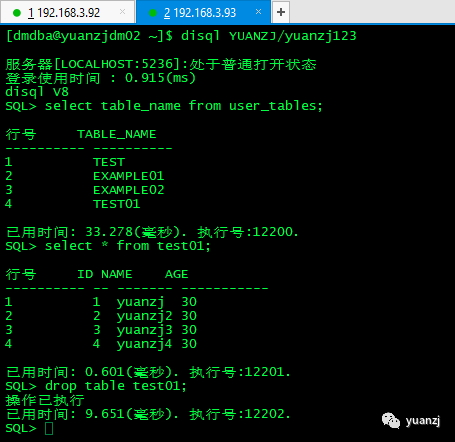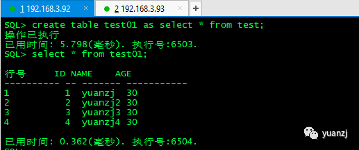 2.节点2登录yuanzj用户,执行下面sql
