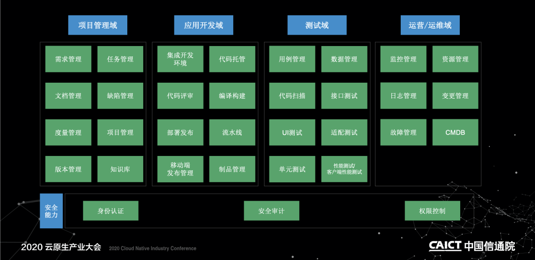 可信云是中国信息通信研究院下属的云计算服务评估品牌,也是我国针对云计算服务的权威评估体系。研发运营(DevOps)解决方案能力分级要求是可信云针对研发运营平台或工具而制定的标准。标准覆盖了项目管理域、应用开发域、测试域、运维/运营域共四大子域,并兼顾平台的安全能力,共计34个功能模块,包含500+能力项,是目前业界最完整、最权威的研发运营(DevOps)解决方案评估标准。