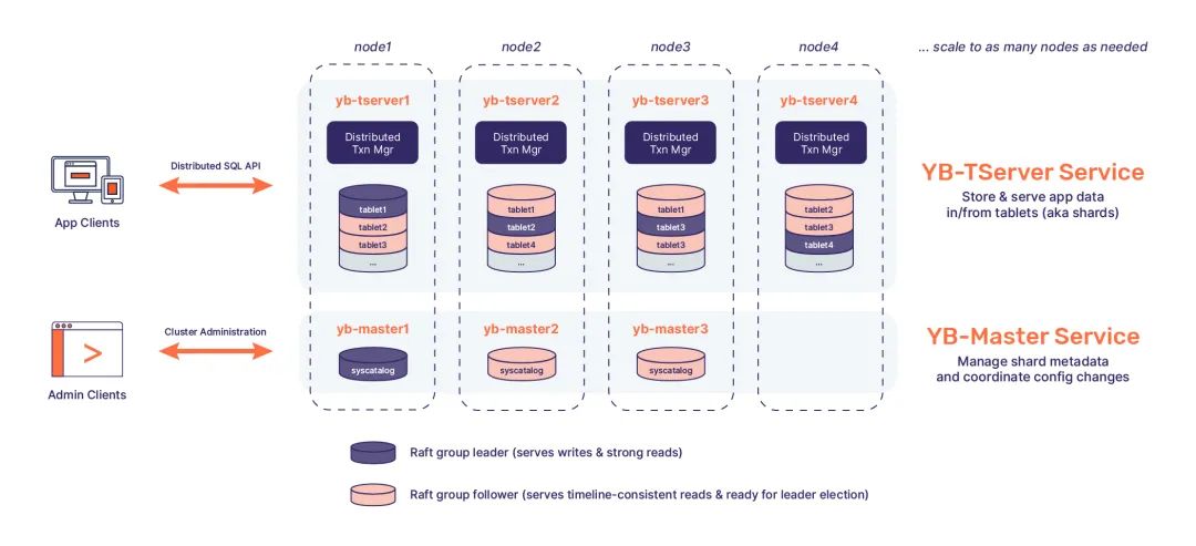 Yugabyte 采用两层架构:查询层和存储层。不过这个架构仅仅是逻辑上的,部署结构中,这两层都位于 TServer 进程中。这一点和 TiDB 不同。