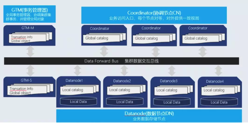 **Coordinator:**协调节点,对外提供接口,负责数据的分发和查询规划,多个节点位置对等,每个节点都提供相同的数据库视图,CN 存储系统的全局元数据。 **Datanode:**处理存储本节点相关的元数据,每个节点还存储数据的一个分片。在功能上,DN 节点负责完成执行协调节点分发的执行请求。 GTM: 全局事务管理器(Global transaction manager.),负责管理集群事务信息,同时管理集群的全局对象,比如序列,除此之外 GTM 上不提供其他的功能。