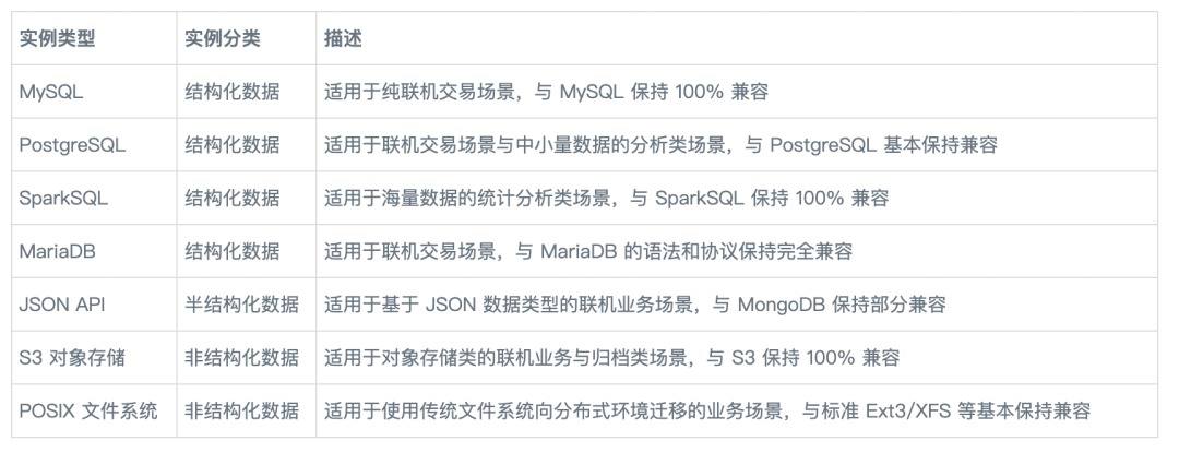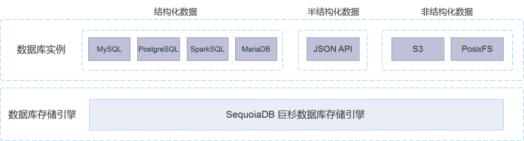 SequoiaDB 巨杉数据库支持 MySQL、PostgreSQL、SparkSQL 和 MariaDB 四种关系型数据库实例、类 MongoDB 的 JSON 文档类数据库实例、以及 S3 对象存储与 POSIX 文件系统的非结构化数据实例。