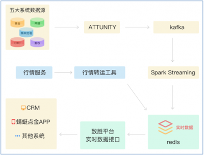 1. Attunity 从五大系统数据源采集盘中产生的实时数据推送到Kafka;同时,行情转运工具从行情服务获取行情数据,推送到Redis;